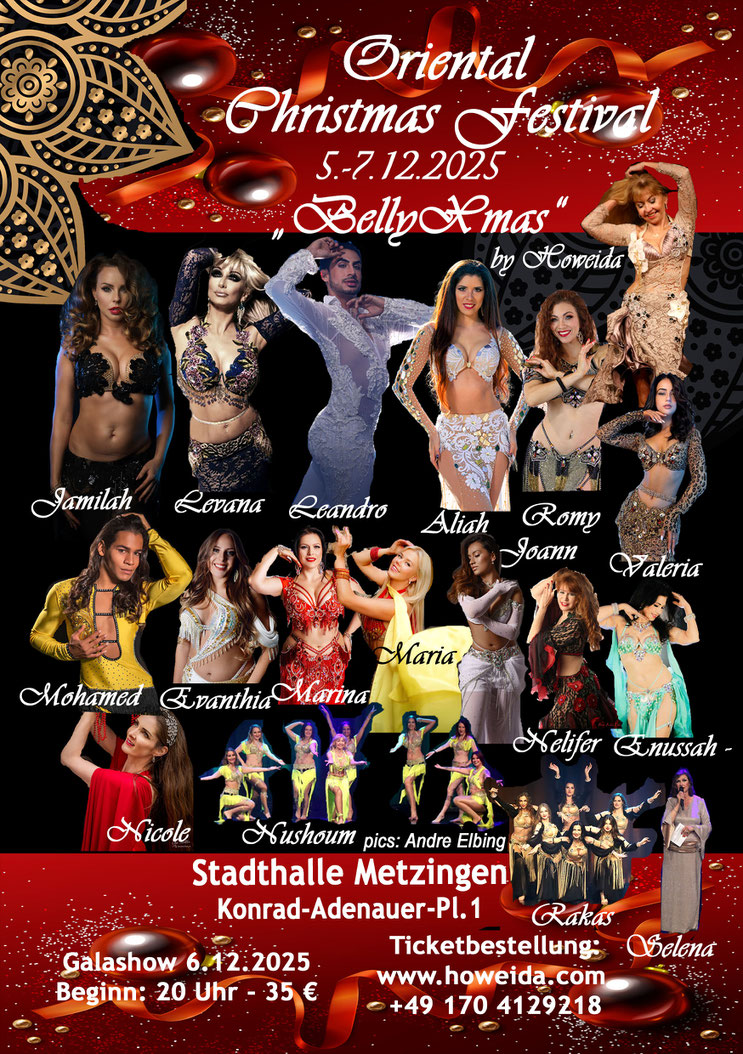 Howeida – powervolle Tänzerin mit Leidenschaft und Eleganz – einfühlsame Lehrerin und phantasievolle Choreographin – Organisatorin des Oriental Christmas festivals in Metzingen -verfügt über fundierte Kenntnisse im Orientalischen Tanz und anderen Tanzstilen, die sie in ihrer langjährigen Tanzpraxis bei verschiedensten in- und ausländischen Tänzern und Tänzerinnen erlernte und vertiefte, Ist Zumba Instructor und zertifizierte Yoga Lehrerin